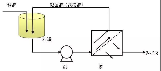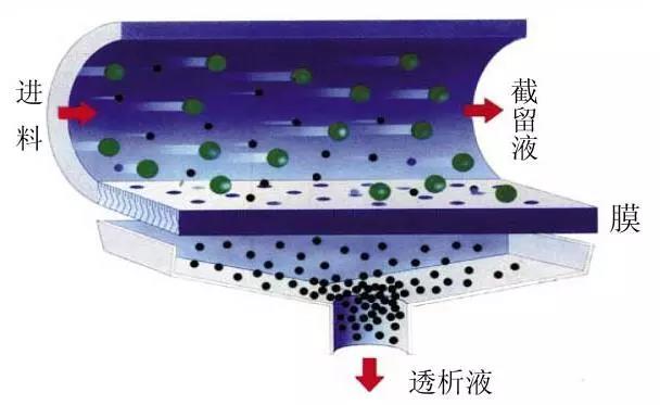 目前常见的膜分离过程以压差为驱动力、以错流过滤方式进行,可在常温下进行分子级的过滤分离,是一种物理过程,其间不发生相变。动力由泵提供,流经膜表面时,部分较小的分子透过膜,而大分子被截留。膜系统组成及基本过滤原理见下图: