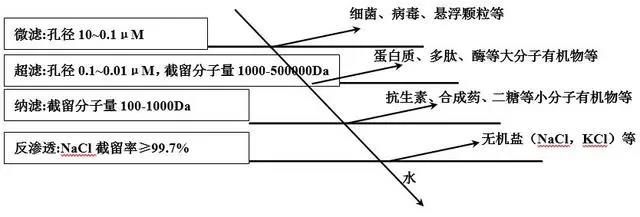 膜分离过程常用的是以压差为动力的液体分离膜。依据膜孔径和截留特性的不同,可分为微滤、超滤、纳滤和反渗透,见下图。